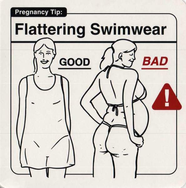 上篇的育嬰教導完全手冊想必讓不少媽媽們受益良多,但照顧嬰兒的前提還是要先能把嬰兒健康的生出來,因此這次David和Kelly Sopp倆相當貼心的提供了孕婦安全教導完全手冊(Safe Baby Pregnancy Tips)。同樣維持著一慣惡搞的風格,只是這次將主角從嬰兒換成了孕婦。