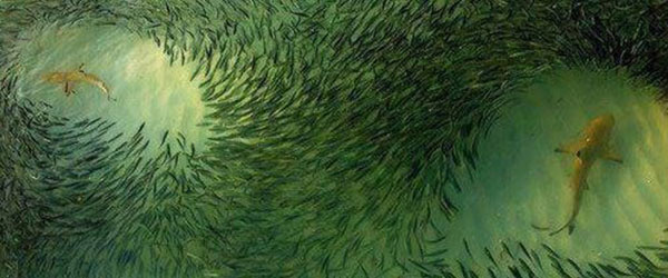 這是鯊魚在海中,魚群紛紛避之唯恐不及的畫面。雖然海面下暗波洶湧,但卻形成了有趣的自然奇景。