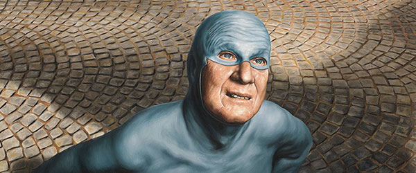 超級英雄等到老了不行了,打擊犯罪也會變得比較吃力…飛踢也許還行,臉上卻少不了恐懼的表情。