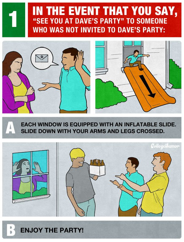 1. 對沒有被邀請的人不小心說出”待會兒在Dave的趴踢上見囉!”