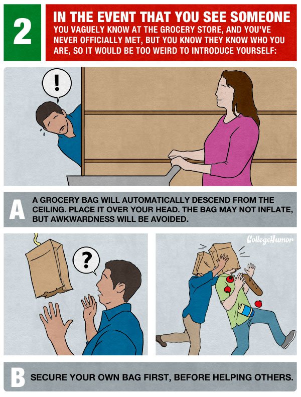 人生中尷尬場合難以避免,就像有時要去比基尼時尚海灘趴,會不小心跑成清朝趴一樣。在這種情況下,如果你總是感到無所適從,以下的圖解說明或許可以對你的人生產生幫助(大誤)。