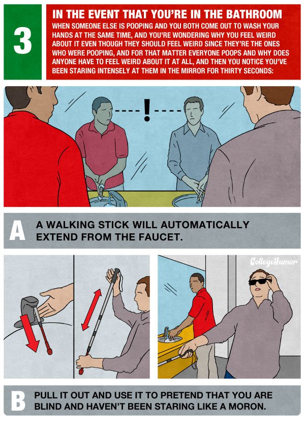 3. 在你跟另外一個陌生人在廁所大便完以後,剛好同時間走出來洗手。你心想為什麼自己感到如此尷尬,畢竟對方也有大便,他應該也要感到尷尬才對,又,在這樣大家都有大便的前提,為什麼有人需要感到尷尬呢?在你這樣想的同時,你發現你已經盯著他看了三十秒。