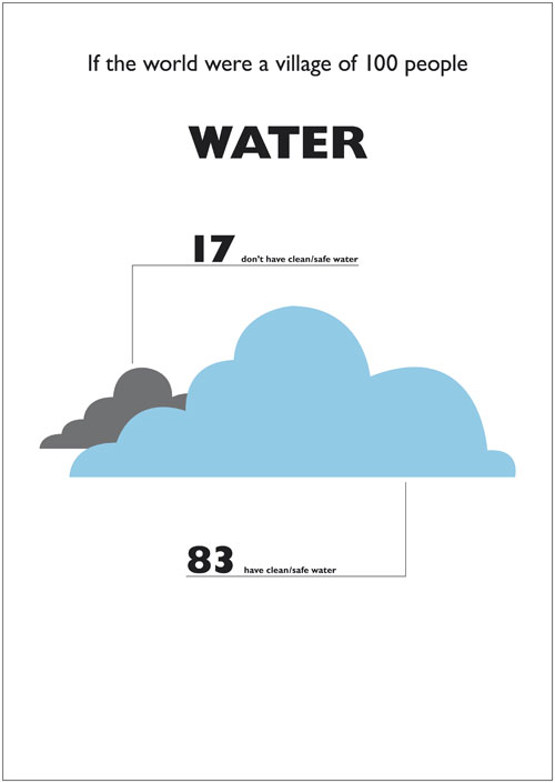 一百人的地球村裡, 會有17個人沒有乾淨或安全的水可以喝,83個人有乾淨或安全的水可以喝。
