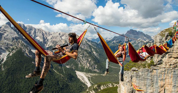 義大利境內的阿爾卑斯山上,一群人用繩索把吊床串在一起,懸掛在山與山之間。景色絕美,但…你有勇氣淡定欣賞嗎?