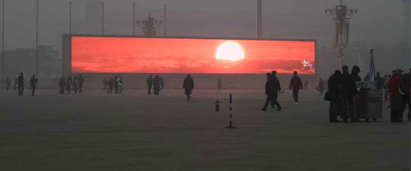 根據時代雜誌的報導,中國北京的空氣汙染問題不斷加劇,現在北京人要看到日出,只能靠天安門廣場的巨行LED螢幕中所撥放的日出影片。